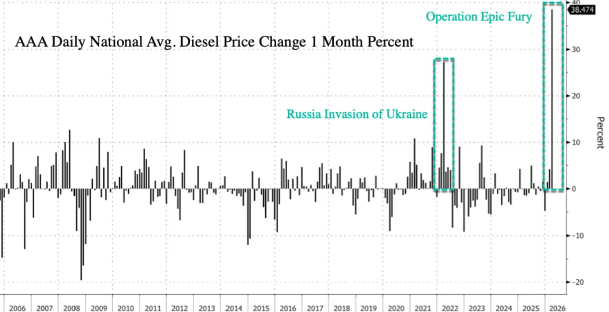 While US gasoline prices have risen substantially since the start of the Iran war (although RBOB futures suggest there is much more upside should oil prices remain around $100), the average price of diesel has already soared above $5 per gallon in the US, the highest since 2022, and pushing up supply chain costs and setting the stage for broader inflation for consumers.